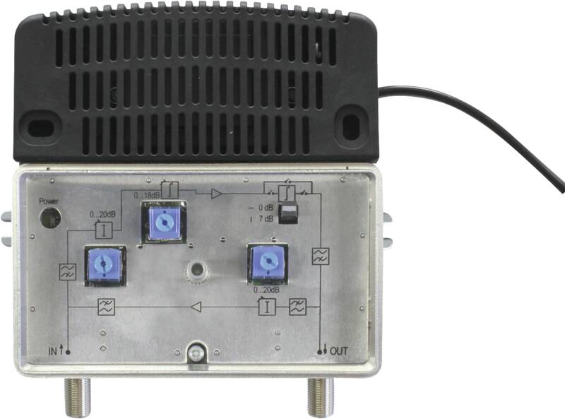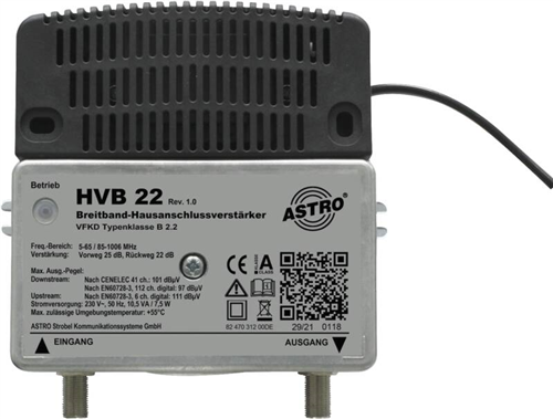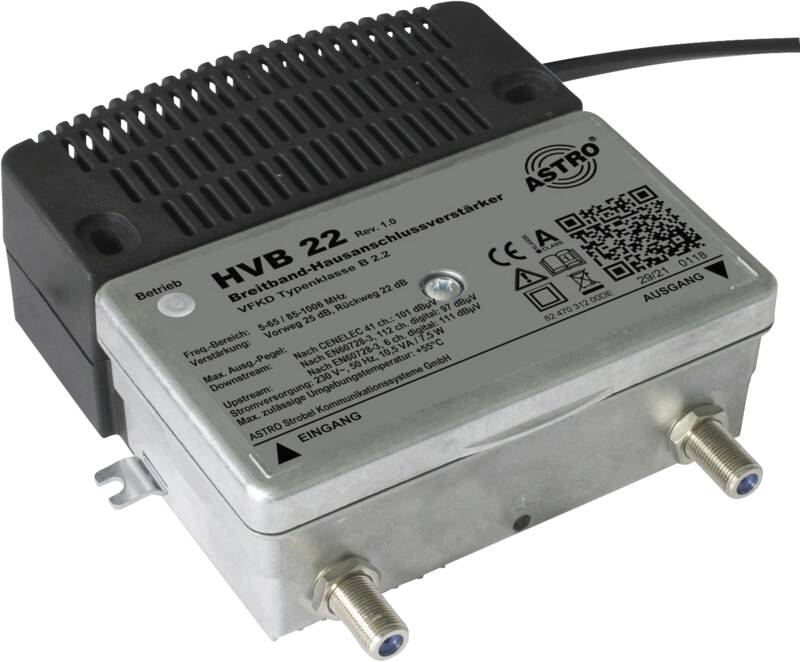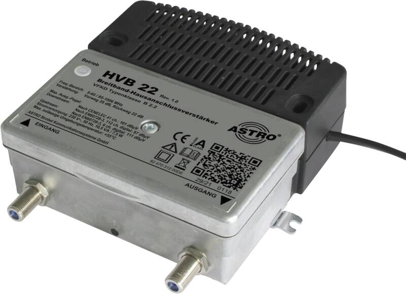 Breitbandverstärker, Hausanschlussverstärker, Eingänge BK: 1, Frequenzbereich 85-1.006MHz, 25 dB Verstärkung, Frequenzbereich Rückweg 5-65MHz, 22 dB Verstärkung Rückweg, Ausgänge: 1, Rückwegfähig, F-Anschlüsse, Pegelsteller von 0,00-20 dB, Leitungsentzerrer