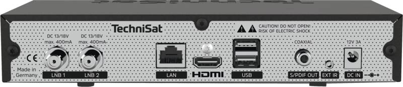 Set-Top-Box, DVB-S, DVB-S2, Twin-Tuner, USB-Recording (PVR-ready), Netzwerk-Recording, gleichzeitige Aufnahme/Wiedergabe, CI+: 1, Front-Display numerisch, Internet-Zugriff auf Online-Dienste, WEB-Browser, OSD mehrsprachig, 9.999 Programmplätze, Videotext eingebaut, Digital-Ausgang koaxial, Netzwerk-Anschluss (Ethernet), HDMI-Anschluss, USB-Anschluss, per App steuerbar